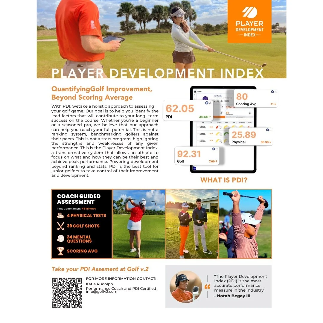 Completing a Coach-Guided Assessment with Coach Brent using PDI takes about 1-Hour. Players will be assessed based on 4 categories: Golf Proficiency, Physical Proficiency, Golf Performance, and Mental Inventory. Players hit a total of 39 golf shots, conduct 4 physical evaluations, log recent competitive rounds, and complete the mental questionnaire.